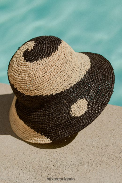 шапката с кофа от слама на Рединг е единствена по рода си част, ръчно изтъкана с шарка ин и ян. завършен с метална плоча за шапки и вътрешна лента за пот.
